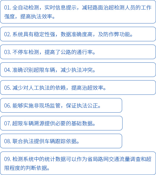 不停車(chē)超限超載檢測(cè)系統(tǒng)主要用于非現(xiàn)場(chǎng)執(zhí)法的治超系統(tǒng)將不停車(chē)動(dòng)態(tài)稱(chēng)重、視頻監(jiān)控、圖像抓拍及車(chē)牌識(shí)別、信息提示系統(tǒng)等有機(jī)集成,建立起一個(gè)全天候貨運(yùn)車(chē)輛超載違法行為監(jiān)控系統(tǒng),對(duì)貨運(yùn)車(chē)輛超載行為實(shí)施有效檢測(cè)和監(jiān)控,為交通管理部門(mén)提供治超執(zhí)法依據(jù)。在車(chē)輛行駛狀態(tài)中的超限超載檢測(cè),有利于提高交通效率。系統(tǒng)的檢測(cè)數(shù)據(jù)資源可為公路行業(yè)交通量調(diào)查、路網(wǎng)監(jiān)測(cè)等管理工作提供共享信息。